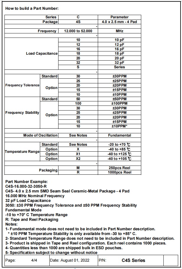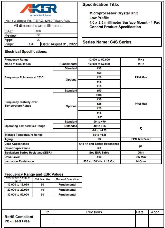 Aker安碁晶振,C4S-18.000-20-3050-R,通訊設備晶振,參數表