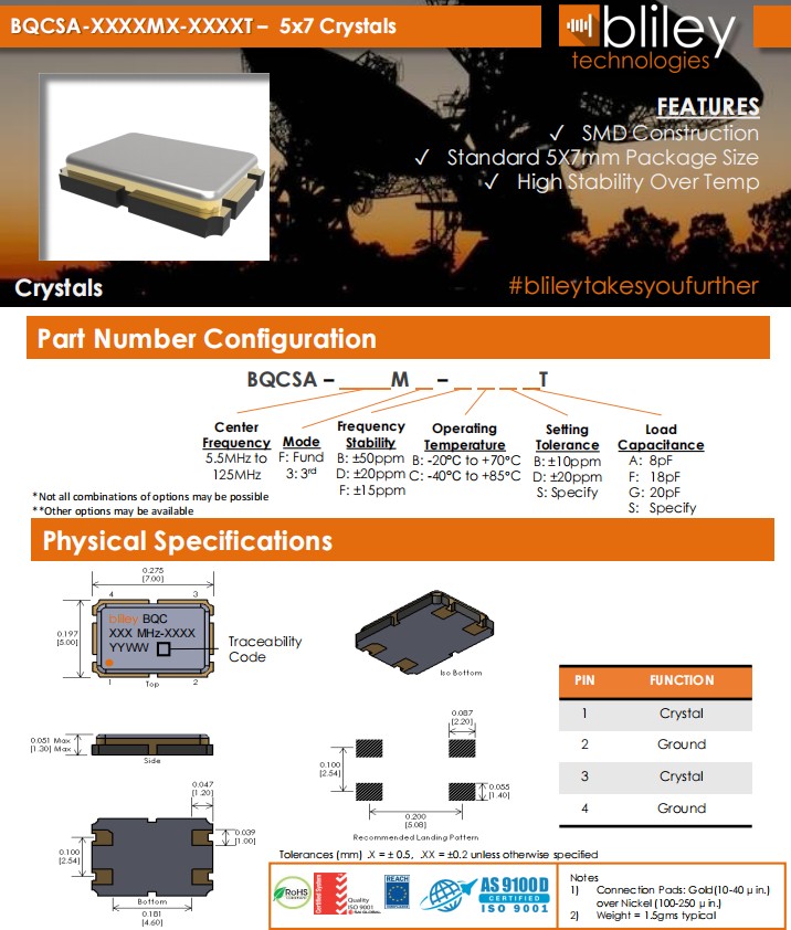 BQCSA-75MF-DCDGT,75MHz,7050mm,Bliley百利晶振,BQCSA,石英貼片晶振,參數表
