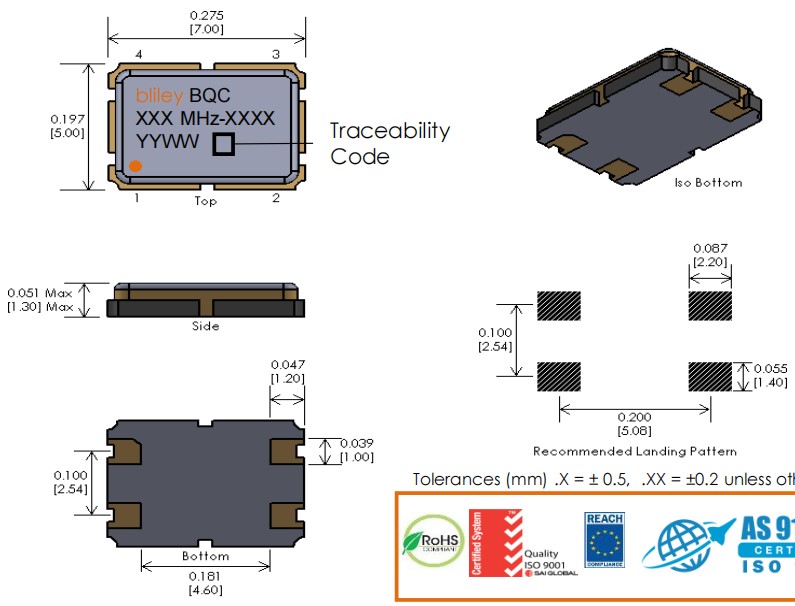 BQCSA-75MF-DCDGT,75MHz,7050mm,Bliley百利晶振,BQCSA,石英貼片晶振,尺寸圖