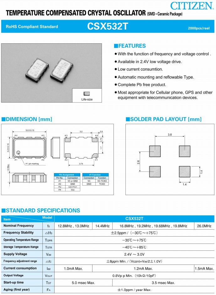 | Citizen晶振 | CSX532T12.800M2-UT10 | CSX532T | 12.8MHz | TCXO | 2.4 V ~ 3 V |