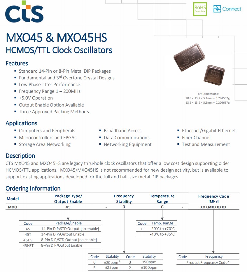 | MXO45-3C-20M0000 | CTS晶振 | MXO45 | 20MHz | ±50ppm | 14-DIP, 4 Leads (Full Size, Metal Can) |