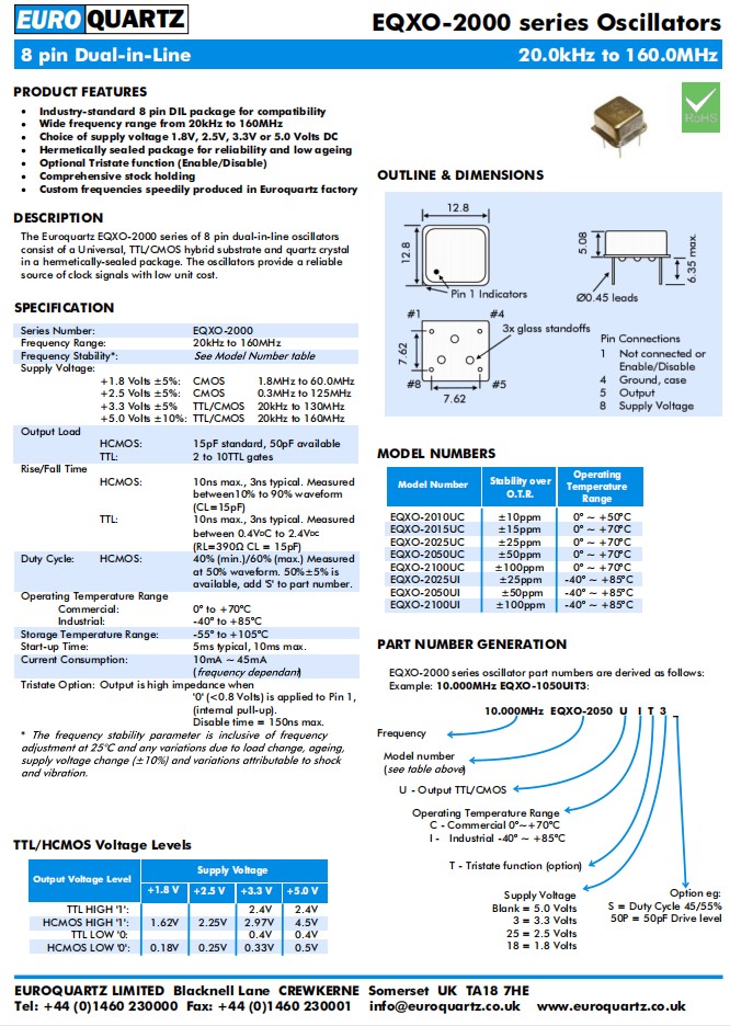 英國EUROQUARTZ有源晶振,10.000MHzEQXO-2050UIT3S,6G網絡設備晶振,參數表
