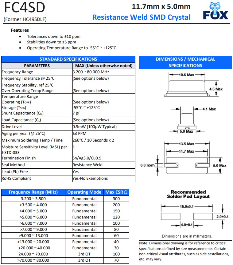 | FC4SDCBMM4.0-T1 | Fox晶振 | FC4SD | 4 MHz | ±50ppm |