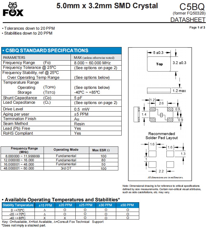 | FQ5032B-18.432 | Fox晶振 | C5BQ | 18.432MHz | ±30ppm |