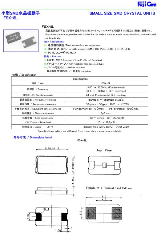 Fujicom晶振,FSX-8L晶振,8MHZ晶振,貼片晶振本身體積小,超薄型石英晶體振蕩器,特別適用于有目前高速發(fā)展的高端電子數(shù)碼產(chǎn)品,因為晶振本身小型化需求的市場領(lǐng)域,小型,薄型是對應(yīng)陶瓷振蕩器(偏差大)和普通的石英晶體振蕩器(偏差小)的中間領(lǐng)域的一種性價比較出色的產(chǎn)品.產(chǎn)品廣泛用于筆記本電腦,無線電話,衛(wèi)星導(dǎo)航SSD,USB,Blu-ray等用途,符合無鉛焊接的高溫回流焊曲線特性.