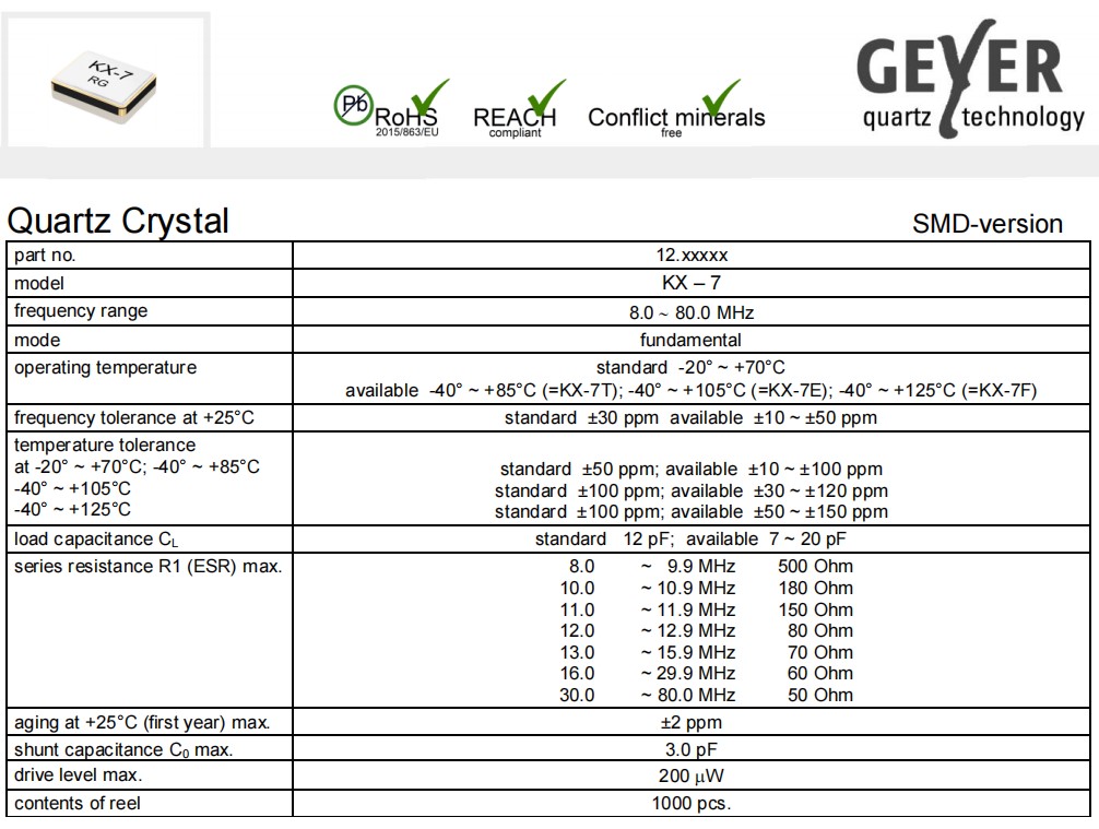 | 12.88722 | Geyer晶振 | Crystal 16.0Mhz SMD KX-7T 12pF, | KX-7T | 16 MHz |