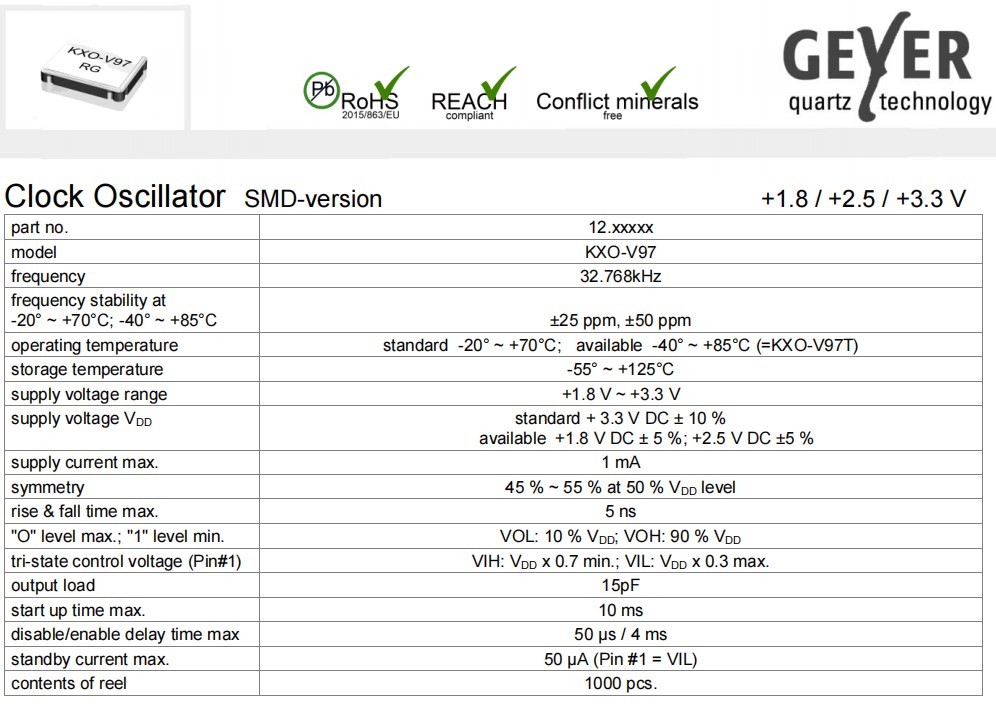 | 12.9034 | Geyer晶振 | XTAL OSC XO 32.7680KHZ SMD | KXO-V94T | 32.768 kHz |