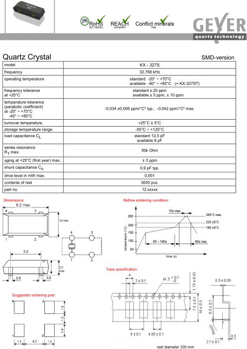 Geyer晶振,KX-327S晶振,無源石英晶體,32.768K時鐘晶體具有小型,薄型,輕型的貼片晶振表面音叉型晶體振蕩器,產品具有優良的耐熱性,耐環境特性,可發揮晶振優良的電氣特性,符合RoHS規定,滿足無鉛焊接的高溫回流溫度曲線要求,金屬外殼的封裝使得產品在封裝時能發揮比陶瓷振蕩器外殼更好的耐沖擊性.