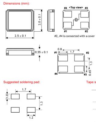 (2) 請仔細處理內外盒與卷帶。外部壓力會導致卷帶受到損壞。耶格晶振,KX-6晶振,2520mm晶振.