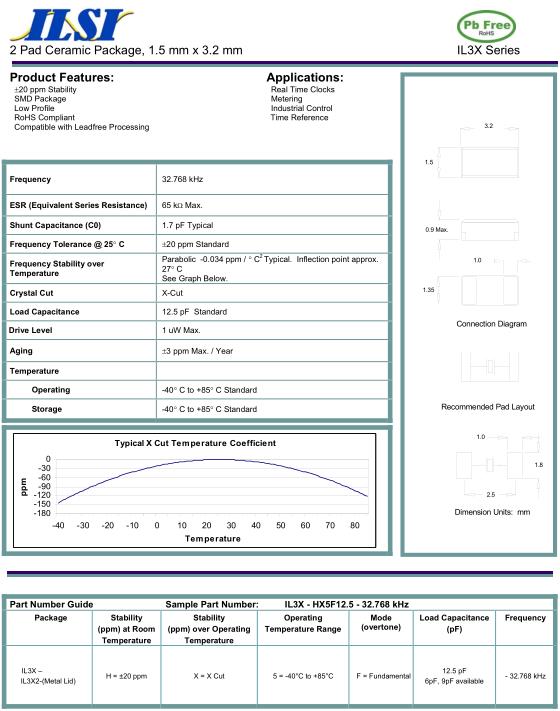 ILSI晶振,IL3X晶振,IL3X-HX5F12.5-32.768kHz晶振,貼片表晶32.768K系列具有超小型,薄型,質地輕的表面貼片音叉型石英晶體振蕩器,晶振產品本身具備優良的耐熱性,耐環境特性,在辦公自動化,家電領域,移動通信領域可發揮優良的電氣特性,符合無鉛標準,滿足無鉛焊接的回流溫度曲線要求,金屬外殼的石英晶振使得產品在封裝時能發揮比陶瓷晶振外殼更好的耐沖擊性能.