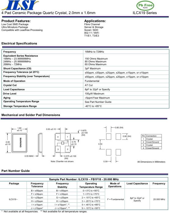 ILSI晶振,ILCX19晶振,ILCX19-FB1F18-20.000MHz晶振,貼片晶振本身體積小,超薄型石英晶體振蕩器,特別適用于有目前高速發(fā)展的高端電子數(shù)碼產品,因為晶振本身小型化需求的市場領域,小型,薄型是對應陶瓷振蕩器(偏差大)和普通的石英晶體振蕩器(偏差小)的中間領域的一種性價比較出色的產品.產品廣泛用于筆記本電腦,無線電話,衛(wèi)星導航SSD,USB,Blu-ray等用途,符合無鉛焊接的高溫回流焊曲線特性.