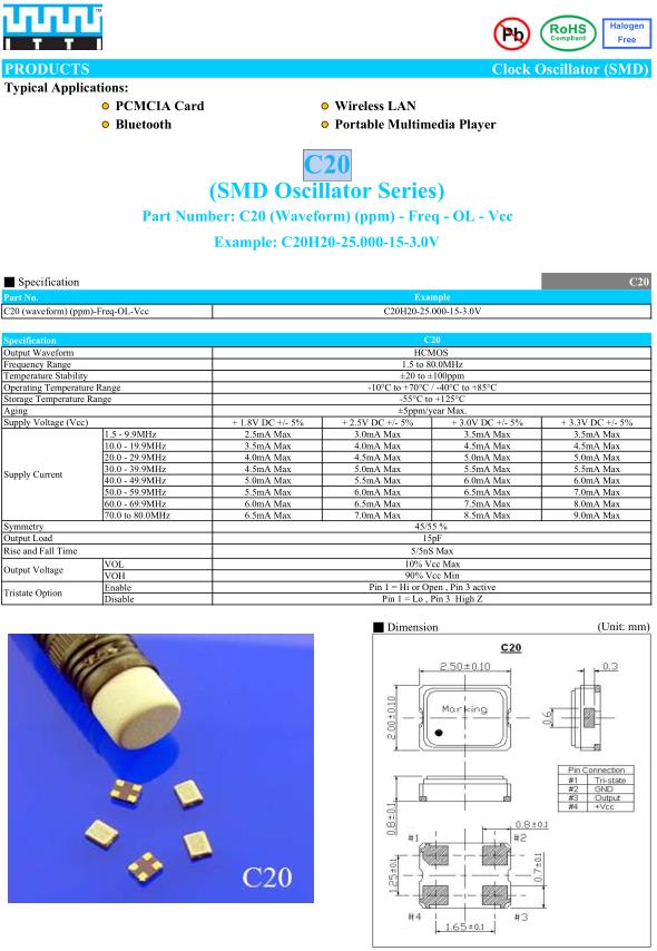 ITTI晶振,C20晶振,C20H20-20.000-15-3.0V晶振,有源晶振,是指晶體本身起振需要外部電壓供應(yīng),起振后可直接驅(qū)動(dòng)CMOS集成電路,產(chǎn)品本身已實(shí)現(xiàn)與薄型IC(TSSOP封裝,TVSOP封裝)同樣的1mm厚度,斷開時(shí)的消費(fèi)電流是15µA以下,編帶包裝方式可對應(yīng)自動(dòng)搭載及IR回流焊接(無鉛對應(yīng))產(chǎn)品有幾種電壓供選1.8V,2.5V,3V3.3V,5V,以應(yīng)對不同IC產(chǎn)品需要.