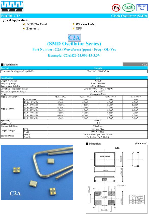 ITTI晶振,C2A晶振,C2AH20-26.000-15-3.3V晶振,2016mm體積的振蕩器,是目前有源晶振中體積最小的一款,產(chǎn)品本身帶溫度補償作用的晶體振蕩器,該體積產(chǎn)品最適合于GPS,以及衛(wèi)星通訊系統(tǒng),智能電話等多用途的高穩(wěn)定的頻率溫度特性晶振.為對應(yīng)低電源電壓的產(chǎn)品.
