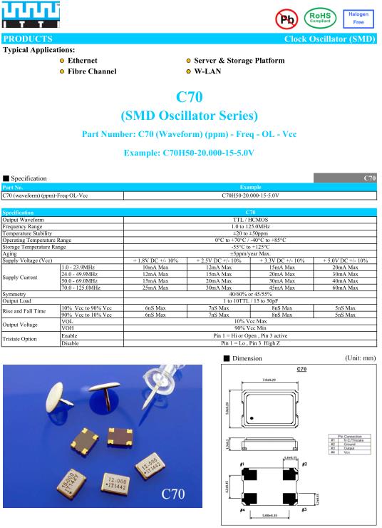 ITTI晶振,C70晶振,C70H50-20.000-15-5.0V晶振,小型SMD有源晶振,從最初超大體積到現在的7050mm,6035mm,5032mm,3225mm,2520mm體積,有著翻天覆地的改變,體積的變小也使產品帶來了更高的穩定性能,接縫密封石英晶體振蕩器,精度高,覆蓋頻率范圍寬的特點,SMD高速自動安裝和高溫回流焊設計,Optionable待機輸出三態輸出功能,電源電壓范圍:1.8V~5V,高穩定性,低抖動,低功耗,主要應用領域:無線通訊,高端智能手機,平板筆記本WLAN,藍牙,數碼相機,DSL和其他IT產品的晶振應用,三態功能,PC和LCDM等高端數碼領域,符合RoHS/無鉛.