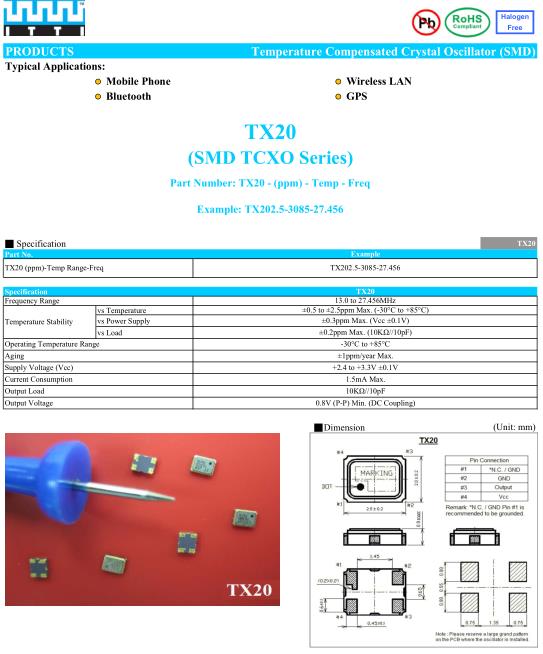 ITTI晶振,TX20晶振,TX202.5-3085-24.000晶振,有源晶振,是指晶體本身起振需要外部電壓供應,起振后可直接驅動CMOS集成電路,產品本身已實現與薄型IC(TSSOP封裝,TVSOP封裝)同樣的1mm厚度,斷開時的消費電流是15µA以下,編帶包裝方式可對應自動搭載及IR回流焊接(無鉛對應)產品有幾種電壓供選1.8V,2.5V,3V3.3V,5V,以應對不同IC產品需要.