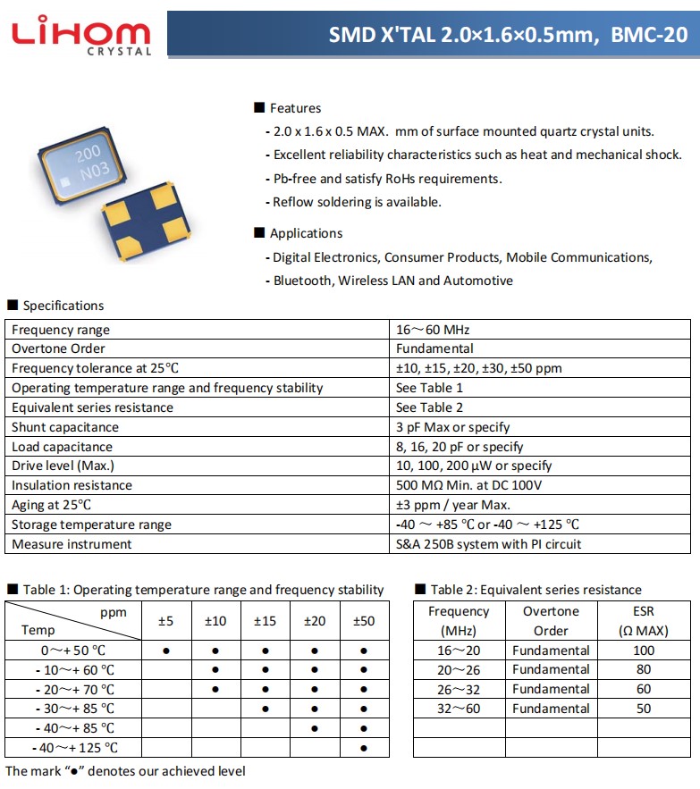 Lihom石英晶體諧振器,BMC-20輕薄型晶振,汽車電子6G晶振,SMD石英晶體,消費電子晶振,參數表
