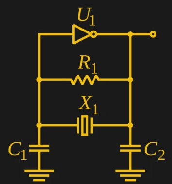 有許多晶體振蕩器配置,但如果使用數字電路,最可能遇到的電路是Pierce振蕩器.您會發現它是使用離散邏輯門以及眾多微處理器和其他IC實現的.晶體配置有一對電容器和一個高值偏置電阻器,作為從反相器輸出到輸入的相移網絡.其中一個電容器有時可以并聯一個小的可變電容器,允許進行非常小的頻率調整以校正各個晶體的容差.在晶體的共振頻率下,晶體上需要180度的相移以維持振蕩.
