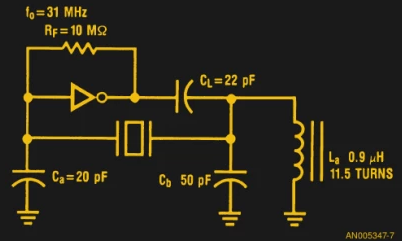 在實踐中,設計用于泛音的晶體將在其基頻的奇數倍處具有共振.因此,例如具有10MHz基頻的泛音晶振也將在30MHz和50MHz處具有泛音諧振. 在上面顯示的皮爾斯電路中放置一個泛音晶體不會導致它以泛音頻率振蕩,而是會在其基頻上運行.泛音振蕩器必須包含一個額外的調諧電路,用于抑制基頻,留下最突出的諧波諧振來決定振蕩頻率.在我們的CMOS振蕩器邏輯應用筆記示例中,逆變器輸出網絡中的電感執行此任務.