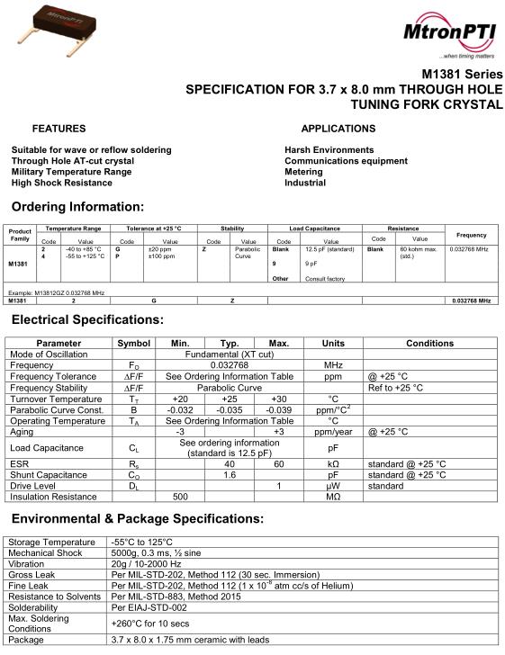 MtronPTI晶振,M1381晶振,M13812GZ0.032768MHz晶振,貼片晶振本身體積小,超薄型石英晶體振蕩器,特別適用于有目前高速發(fā)展的高端電子數(shù)碼產(chǎn)品,因?yàn)榫д癖旧硇⌒突枨蟮氖袌?chǎng)領(lǐng)域,小型,薄型是對(duì)應(yīng)陶瓷振蕩器(偏差大)和普通的石英晶體振蕩器(偏差小)的中間領(lǐng)域的一種性價(jià)比較出色的產(chǎn)品.產(chǎn)品廣泛用于筆記本電腦,無線電話,衛(wèi)星導(dǎo)航SSD,USB,Blu-ray等用途,符合無鉛焊接的高溫回流焊曲線特性.