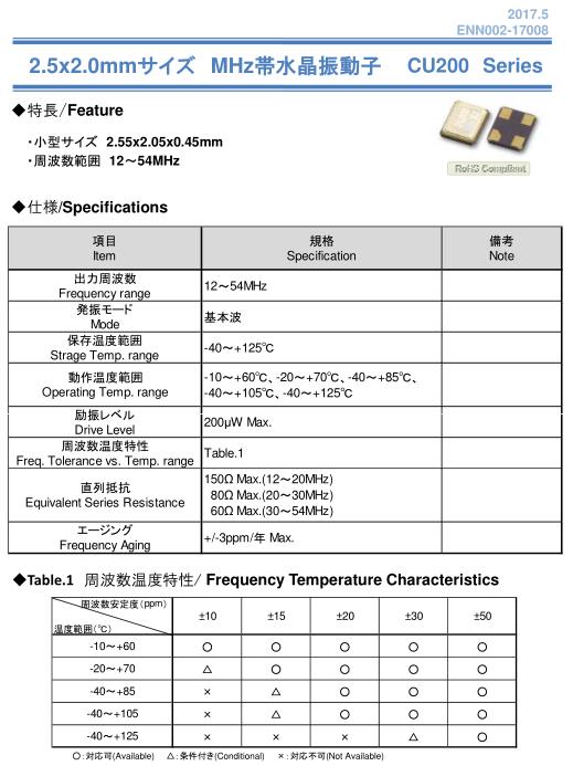 NAKA晶振,CU200晶振,2520mm晶振,小型貼片石英晶振,外觀尺寸具有薄型表面貼片型石英晶體振蕩器,特別適用于有小型化要求的市場領域,比如智能手機,無線藍牙,平板電腦等電子數碼產品.晶振本身超小型,薄型,重量輕,晶體具有優良的耐環境特性,如耐熱性,耐沖擊性,在辦公自動化,家電相關電器領域及Bluetooth,WirelessLAN等短距離無線通信領域可發揮優良的電氣特性,滿足無鉛焊接的回流溫度曲線要求.