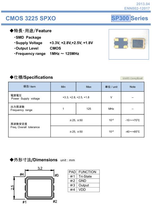 NAKA晶振,SP300晶振,SPXO普通有源晶振,小型SMD有源晶振,從最初超大體積到現在的7050mm,6035mm,5032mm,3225mm,2520mm體積,有著翻天覆地的改變,體積的變小也使產品帶來了更高的穩定性能,接縫密封石英晶體振蕩器,精度高,覆蓋頻率范圍寬的特點,SMD高速自動安裝和高溫回流焊設計,Optionable待機輸出三態輸出功能,電源電壓范圍:1.8V~5V,高穩定性,低抖動,低功耗,主要應用領域:無線通訊,高端智能手機,平板筆記本WLAN,藍牙,數碼相機,DSL和其他IT產品的晶振應用,三態功能,PC和LCDM等高端數碼領域,符合RoHS/無鉛.