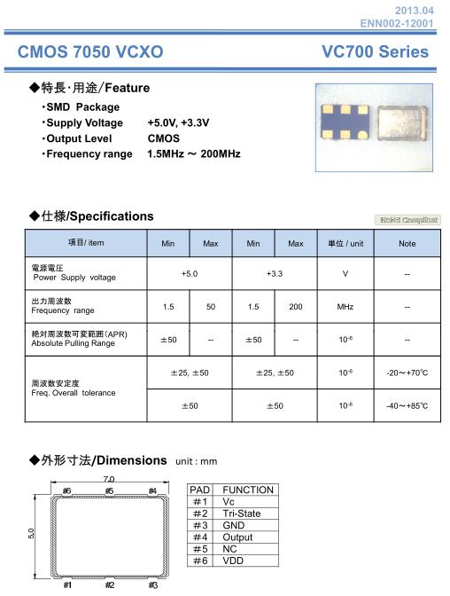NAKA晶振,VC700晶振,VCXO晶振,小型SMD有源晶振,從最初超大體積到現在的7050mm,6035mm,5032mm,3225mm,2520mm體積,有著翻天覆地的改變,體積的變小也使產品帶來了更高的穩定性能,接縫密封石英晶體振蕩器,精度高,覆蓋頻率范圍寬的特點,SMD高速自動安裝和高溫回流焊設計,Optionable待機輸出三態輸出功能,電源電壓范圍:1.8V~5V,高穩定性,低抖動,低功耗,主要應用領域:無線通訊,高端智能手機,平板筆記本WLAN,藍牙,數碼相機,DSL和其他IT產品的晶振應用,三態功能,PC和LCDM等高端數碼領域,符合RoHS/無鉛.