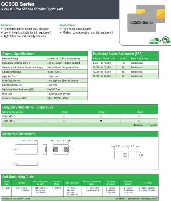 Qantek Crystal康泰克晶振公司成立于2005年,總部位于美國佛羅里達州勞德代爾市.主要生產提供高可靠性的微處理器晶體和石英晶體諧振器以及有源晶振等元件.康泰克晶振,QC5CB晶振,QC5CB12.0000F12B33R晶振.