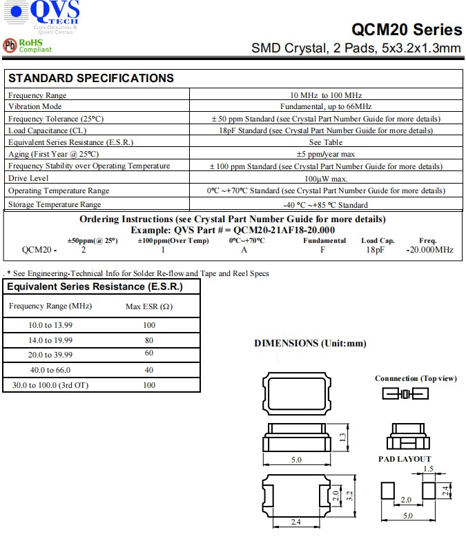 QCM20-21AF18-48.000MHz,5032mm,48M,QVS無源晶振,QCM20,兩腳貼片晶振,參數表