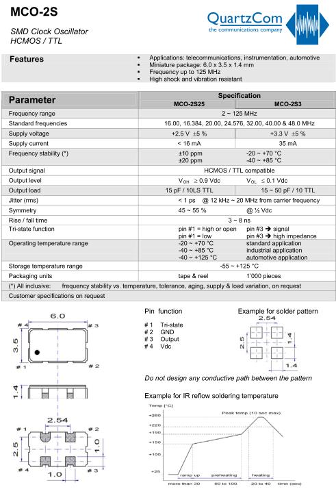 QuartzCom晶振,MCO-2S25晶振,6035mm晶振,小型SMD有源晶振,從最初超大體積到現在的7050mm,6035mm,5032mm,3225mm,2520mm體積,有著翻天覆地的改變,體積的變小也使產品帶來了更高的穩定性能,接縫密封石英晶體振蕩器,精度高,覆蓋頻率范圍寬的特點,SMD高速自動安裝和高溫回流焊設計,Optionable待機輸出三態輸出功能,電源電壓范圍:1.8V~5V,高穩定性,低抖動,低功耗,主要應用領域:無線通訊,高端智能手機,平板筆記本WLAN,藍牙,數碼相機,DSL和其他IT產品的晶振應用,三態功能,PC和LCDM等高端數碼領域,符合RoHS/無鉛.