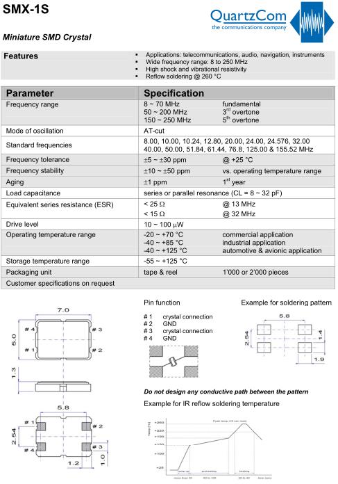 QuartzCom晶振,SMX-1S晶振,無源四腳晶振,貼片晶振本身體積小,超薄型石英晶體振蕩器,特別適用于有目前高速發展的高端電子數碼產品,因為晶振本身小型化需求的市場領域,小型,薄型是對應陶瓷振蕩器(偏差大)和普通的石英晶體振蕩器(偏差小)的中間領域的一種性價比較出色的產品.產品廣泛用于筆記本電腦,無線電話,衛星導航SSD,USB,Blu-ray等用途,符合無鉛焊接的高溫回流焊曲線特性.