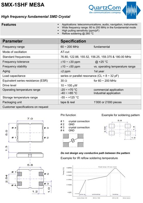 QuartzCom晶振,SMX-1SHF晶振,無源貼片晶振,貼片晶振本身體積小,超薄型石英晶體振蕩器,特別適用于有目前高速發(fā)展的高端電子數(shù)碼產(chǎn)品,因?yàn)榫д癖旧硇⌒突枨蟮氖袌?chǎng)領(lǐng)域,小型,薄型是對(duì)應(yīng)陶瓷振蕩器(偏差大)和普通的石英晶體振蕩器(偏差小)的中間領(lǐng)域的一種性價(jià)比較出色的產(chǎn)品.產(chǎn)品廣泛用于筆記本電腦,無線電話,衛(wèi)星導(dǎo)航SSD,USB,Blu-ray等用途,符合無鉛焊接的高溫回流焊曲線特性.