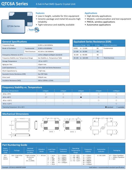 Quarztechnik晶振,QTC6A晶振,QTC6A12.0000FBT3I30R晶振,貼片晶振本身體積小,超薄型石英晶體振蕩器,特別適用于有目前高速發展的高端電子數碼產品,因為晶振本身小型化需求的市場領域,小型,薄型是對應陶瓷振蕩器(偏差大)和普通的石英晶體振蕩器(偏差小)的中間領域的一種性價比較出色的產品.產品廣泛用于筆記本電腦,無線電話,衛星導航SSD,USB,Blu-ray等用途,符合無鉛焊接的高溫回流焊曲線特性.