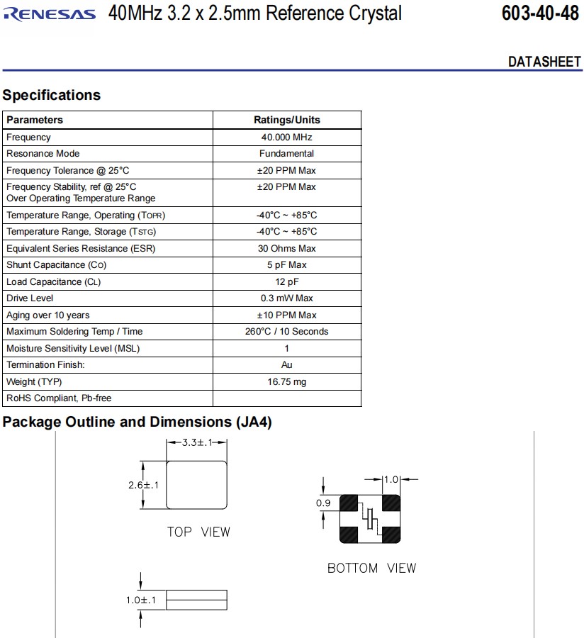 Renesas無源晶振,603-40-48JA4I8,6G無線網絡晶振,參數表