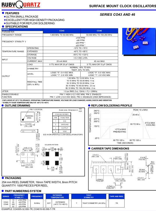 Rubyquartz晶振-Rubyquartz Crystal是領先的頻率元件供應商之一,主要提供市場盧柏貼片晶振,有源晶振,溫補晶振,石英晶體等,Rubyquartz晶振集團致力于向全球用戶提供優質的晶振產品,并確保每一顆晶振的完整度,讓用戶使用上性能優越,價格低廉的晶振產品.Rubyquartz晶振,CO43晶振,CO4305-26.000-TR晶振.