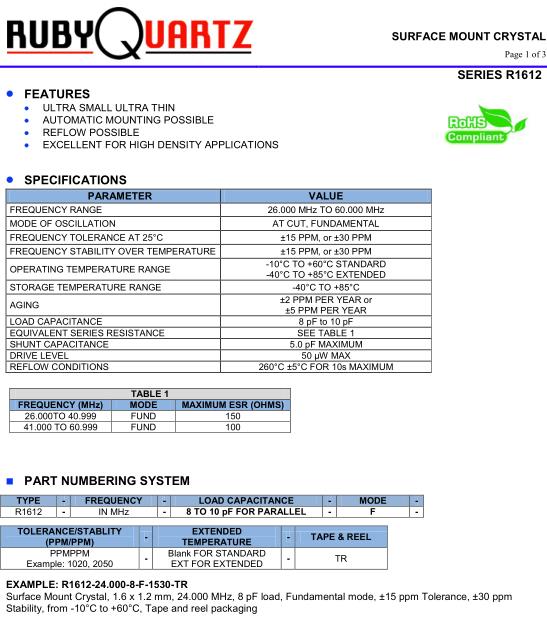 Rubyquartz晶振,R1612晶振,R1612-24.000-8-F-1530-TR晶振,貼片晶振本身體積小,超薄型石英晶體振蕩器,特別適用于有目前高速發展的高端電子數碼產品,因為晶振本身小型化需求的市場領域,小型,薄型是對應陶瓷振蕩器(偏差大)和普通的石英晶體振蕩器(偏差小)的中間領域的一種性價比較出色的產品.產品廣泛用于筆記本電腦,無線電話,衛星導航SSD,USB,Blu-ray等用途,符合無鉛焊接的高溫回流焊曲線特性.