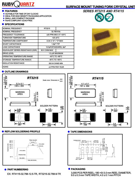 Rubyquartz晶振,RT3215晶振,RT3215-32.768-8-TR晶振,32.768K時鐘晶體具有小型,薄型,輕型的貼片晶振表面音叉型晶體振蕩器,產(chǎn)品具有優(yōu)良的耐熱性,耐環(huán)境特性,可發(fā)揮晶振優(yōu)良的電氣特性,符合RoHS規(guī)定,滿足無鉛焊接的高溫回流溫度曲線要求,金屬外殼的封裝使得產(chǎn)品在封裝時能發(fā)揮比陶瓷振蕩器外殼更好的耐沖擊性.