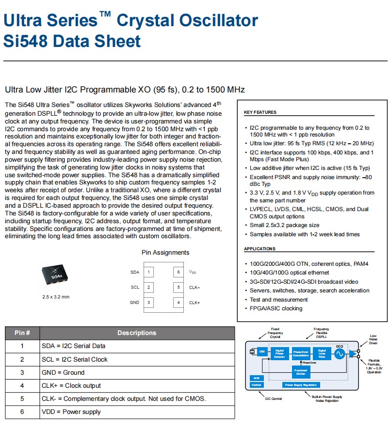 Si548超低抖動I2C可編程XO(95 fs),Si548超系列™振蕩器利用天空解決方案先進的第四代DSPLL®技術,在任何輸出頻率提供超低抖動、低相位噪聲時鐘。該設備通過簡單的I2C命令進行用戶編程,提供從0.2到1500 MHz的任何頻率和<1 ppb分辨率,并在其工作范圍內對整數和分數頻率保持異常低的抖動。Si548石英晶體振蕩器提供了良好的可靠性和頻率穩定性,并保證了老化性能。片上電源濾波提供了行業領先的電源噪聲抑制,簡化了在使用切換模式電源的有噪聲系統中產生低抖動時鐘的任務。Si548有一個大大簡化的供應鏈,使Skyworks能夠在收到訂單1-2周后運送定制的頻率的樣品。與傳統的XO不同,每個輸出頻率都需要不同的晶體,Si548使用一個簡單的晶體和一種基于DSPLL ic的方法來提供所需的輸出頻率。Si548可在工廠中配置各種用戶規格,包括啟動頻率、I2C地址、輸出格式和溫度穩定性。特定的配置是在裝運時由工廠編程的,消除了與自定義振蕩器相關的長交貨時間。