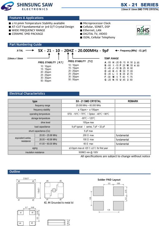 Shinsung晶振,SX-21晶振,SX-21-10-20HZ-20.000MHz-9pF晶振,貼片晶振本身體積小,超薄型石英晶體振蕩器,特別適用于有目前高速發展的高端電子數碼產品,因為晶振本身小型化需求的市場領域,小型,薄型是對應陶瓷振蕩器(偏差大)和普通的石英晶體振蕩器(偏差小)的中間領域的一種性價比較出色的產品.產品廣泛用于筆記本電腦,無線電話,衛星導航SSD,USB,Blu-ray等用途,符合無鉛焊接的高溫回流焊曲線特性.