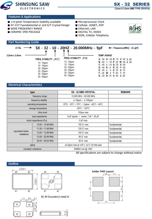 Shinsung晶振,SX-32晶振,SX-32-10-20HZ-24.000MHz-9pF晶振,小型貼片石英晶振,外觀尺寸具有薄型表面貼片型石英晶體振蕩器,特別適用于有小型化要求的市場領域,比如智能手機,無線藍牙,平板電腦等電子數碼產品.晶振本身超小型,薄型,重量輕,晶體具有優良的耐環境特性,如耐熱性,耐沖擊性,在辦公自動化,家電相關電器領域及Bluetooth,WirelessLAN等短距離無線通信領域可發揮優良的電氣特性,滿足無鉛焊接的回流溫度曲線要求..