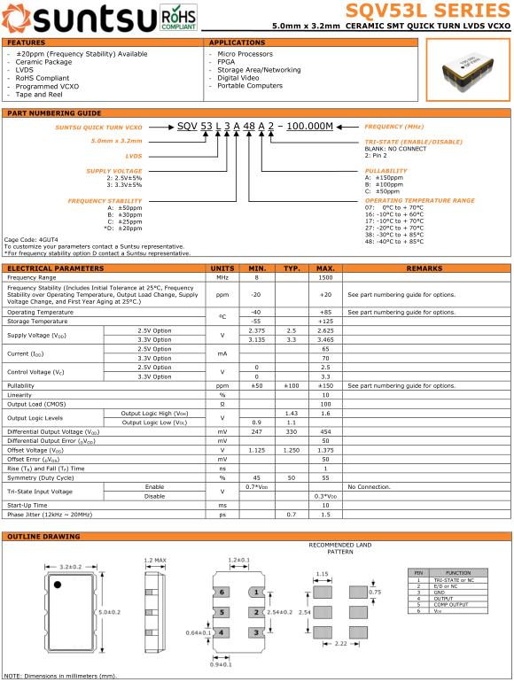 Suntsu晶振,SQV53L晶振,SQV53L3A48A2-20.000M晶振,有源晶振,是指晶體本身起振需要外部電壓供應,起振后可直接驅動CMOS集成電路,產品本身已實現與薄型IC(TSSOP封裝,TVSOP封裝)同樣的1mm厚度,斷開時的消費電流是15µA以下,編帶包裝方式可對應自動搭載及IR回流焊接(無鉛對應)產品有幾種電壓供選1.8V,2.5V,3V3.3V,5V,以應對不同IC產品需要.