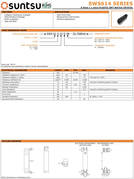 Suntsu晶振,SWS614晶振,SWS61412D48-32.768kHz晶振,32.768K時鐘晶體具有小型,薄型,輕型的貼片晶振表面音叉型晶體振蕩器,產品具有優良的耐熱性,耐環境特性,可發揮晶振優良的電氣特性,符合RoHS規定,滿足無鉛焊接的高溫回流溫度曲線要求,金屬外殼的封裝使得產品在封裝時能發揮比陶瓷振蕩器外殼更好的耐沖擊性.