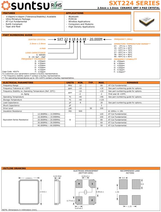 Suntsu晶振,SXT224晶振,SXT22418AA48-20.000M晶振,小型貼片石英晶振,外觀尺寸具有薄型表面貼片型石英晶體振蕩器,特別適用于有小型化要求的市場領域,比如智能手機,無線藍牙,平板電腦等電子數碼產品.晶振本身超小型,薄型,重量輕,晶體具有優良的耐環境特性,如耐熱性,耐沖擊性,在辦公自動化,家電相關電器領域及Bluetooth,WirelessLAN等短距離無線通信領域可發揮優良的電氣特性,滿足無鉛焊接的回流溫度曲線要求.