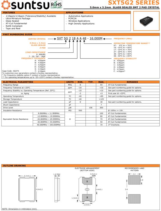 Suntsu晶振,SXT5G2晶振,SXT5G218AA48-16.000M晶振,智能手機(jī)晶振,產(chǎn)品具有高精度超小型的表面貼片型石英晶體振蕩器,最適用于移動(dòng)通信終端的基準(zhǔn)時(shí)鐘等移動(dòng)通信領(lǐng)域.比如智能手機(jī),無(wú)線通信,衛(wèi)星導(dǎo)航,平臺(tái)基站等較高端的數(shù)碼產(chǎn)品,晶振本身小型,薄型具備各類(lèi)移動(dòng)通信的基準(zhǔn)時(shí)鐘源用頻率,貼片晶振具有優(yōu)良的電氣特性,耐環(huán)境性能適用于移動(dòng)通信領(lǐng)域,滿足無(wú)鉛焊接的高溫回流溫度曲線要求.