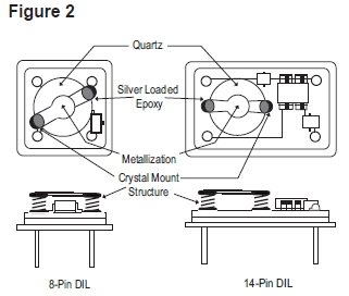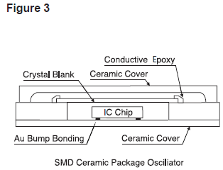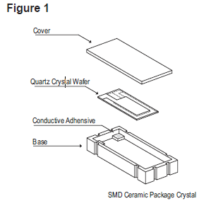 石英晶振單元包括一個(gè)石英小條或小圓盤(pán),根據(jù)客戶指定的諧振頻率加工成精確的尺寸和厚度.石英鍍有導(dǎo)電電極,并安裝在密封的保護(hù)外殼中(見(jiàn)圖1). 電極通過(guò)玻璃-金屬密封連接到穿過(guò)基座組件的引線,或者在SMD陶瓷封裝的情況下(見(jiàn)圖1);電極通過(guò)層狀電鍍陶瓷連接到焊盤(pán).