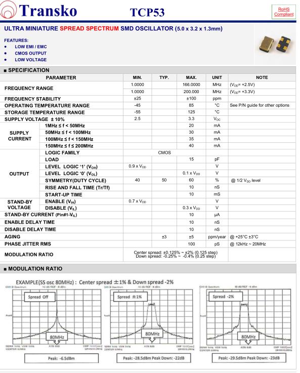 Transko晶振,TCP53晶振,TCP53-H50HM33ST-A-24.000M-TR晶振,5032mm體積的石英晶體振蕩器,有源晶振,該產品可驅動2.5V的溫補晶振,壓控晶振,VC-TCXO晶體振蕩器產品,電源電壓的低電耗型,編帶包裝方式,可對應自動高速貼片機自動焊接,及IR回流焊接(無鉛對應),為無鉛產品,超小型,質地輕.產品被廣泛應用到集成電路,程控交換系統,無線發射基站.