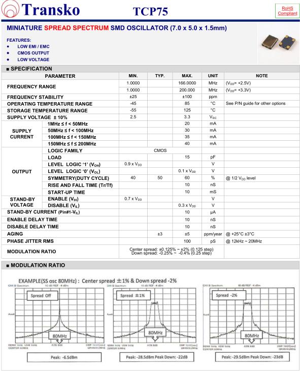 Transko晶振,TCP75晶振,TCP75-H50HM33SA-24.000M-TR晶振,小型SMD有源晶振,從最初超大體積到現在的7050mm,6035mm,5032mm,3225mm,2520mm體積,有著翻天覆地的改變,體積的變小也使產品帶來了更高的穩定性能,接縫密封石英晶體振蕩器,精度高,覆蓋頻率范圍寬的特點,SMD高速自動安裝和高溫回流焊設計,Optionable待機輸出三態輸出功能,電源電壓范圍:1.8V~5V,高穩定性,低抖動,低功耗,主要應用領域:無線通訊,高端智能手機,平板筆記本WLAN,藍牙,數碼相機,DSL和其他IT產品的晶振應用,三態功能,PC和LCDM等高端數碼領域,符合RoHS/無鉛.