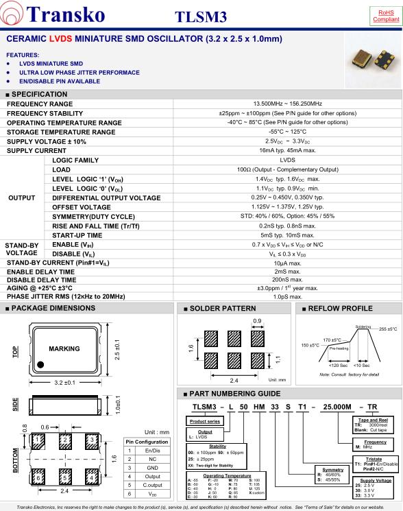 Transko晶振,TLSM3晶振,TLSM3-L50HM33ST1-24.000M-TR晶振,小型SMD有源晶振,從最初超大體積到現在的7050mm,6035mm,5032mm,3225mm,2520mm體積,有著翻天覆地的改變,體積的變小也使產品帶來了更高的穩定性能,接縫密封石英晶體振蕩器,精度高,覆蓋頻率范圍寬的特點,SMD高速自動安裝和高溫回流焊設計,Optionable待機輸出三態輸出功能,電源電壓范圍:1.8V~5V,高穩定性,低抖動,低功耗,主要應用領域:無線通訊,高端智能手機,平板筆記本WLAN,藍牙,數碼相機,DSL和其他IT產品的晶振應用,三態功能,PC和LCDM等高端數碼領域,符合RoHS/無鉛.