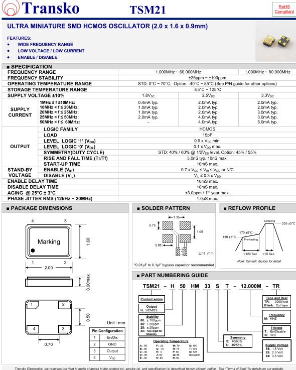Transko晶振,TSM21晶振,TSM21-H50HM33ST-12.000-TR晶振,小型SMD有源晶振,從最初超大體積到現(xiàn)在的7050mm,6035mm,5032mm,3225mm,2520mm體積,有著翻天覆地的改變,體積的變小也使產(chǎn)品帶來了更高的穩(wěn)定性能,接縫密封石英晶體振蕩器,精度高,覆蓋頻率范圍寬的特點,SMD高速自動安裝和高溫回流焊設(shè)計,Optionable待機輸出三態(tài)輸出功能,電源電壓范圍:1.8V~5V,高穩(wěn)定性,低抖動,低功耗,主要應(yīng)用領(lǐng)域:無線通訊,高端智能手機,平板筆記本W(wǎng)LAN,藍牙,數(shù)碼相機,DSL和其他IT產(chǎn)品的晶振應(yīng)用,三態(tài)功能,PC和LCDM等高端數(shù)碼領(lǐng)域,符合RoHS/無鉛.