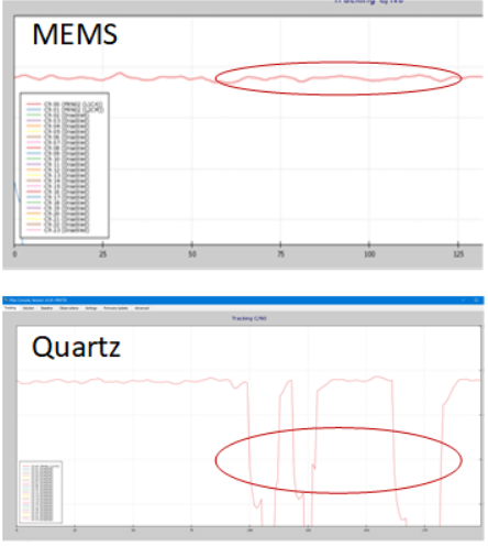 MEMS與石英相比,用于通過熱空氣流動和振動攻絲進行衛(wèi)星跟蹤.石英失去了幾次跟蹤;MEMS保持穩(wěn)定.