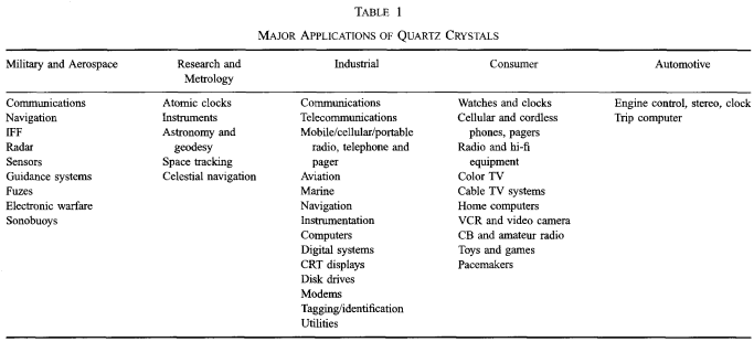 在人造單晶中,石英的生長量僅次于硅.每年大約生長2500到3000噸石英晶體(大約是硅生長量的3到4倍).主要應用是時鐘和頻率源的振蕩器.其他重要應用是傳感器和用于頻率選擇的濾波器.每年制造大約2xl09體聲波(BAW)石英諧振器和幾億個石英聲表面濾波器(聲表面波)器件. 石英晶體的主要應用見表1.第四欄和第五欄中的應用程序占年度生產的大部分,但第一欄和第二欄中的應用程序要求最高.